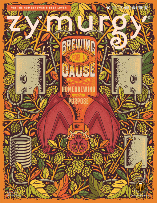 The March/April 2025 Zymurgy highlights the Hogtown Brewers bat-themed philanthropy, the ReBrew Wastewater Challenge, Himalayan Rice Beer, Happiness Through Homebrew, and Zoiglbier.